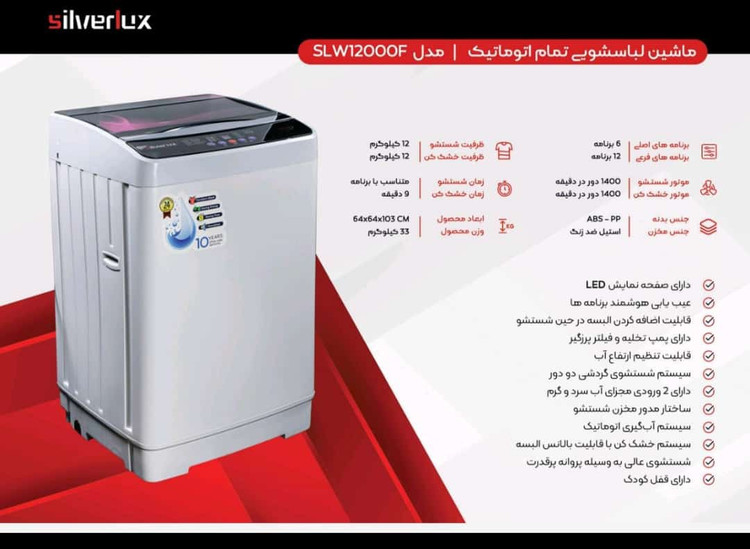 لباسشویی درب بالا اتوماتیک خشک کن ۱۲ کیلویی سیلورلوکس مدلslw12000f